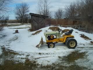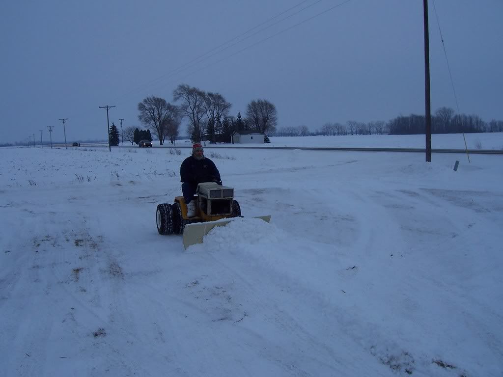 Well I finally got to use my modified blade on homemade mount on my 122.First ran out of gas on 4th drive way broke generator belt wife came out said boss calling so headed for shed wooden ramps too slick to get up into the shed so shut off to call boss back and get metal ramps out realized now could not start no belt tried to winch into shed no anchor point finall push winch using snapper wedged against snow blower and tiller got with in a foot of top of ramps got daughter to try and help push no luck came in to warm up and rest both wife daughter winch and pushing my self got in shed now will have to go and get belt today.Good news blade worked good electric winch lift worked good old tire tread cutting edge worked good had lot of fun dont have digital camera but will have some pictures when get developed.Today another day !