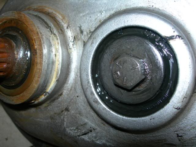 ![]() ![]() ![]() This is the leaky area. I checked out the parts diagram and it only shows a bearing cartridge a washer and the bolt, no seal. I guess I'll be digging in to the gear box. The front gear box is in great shape, and everything turns free and easy.