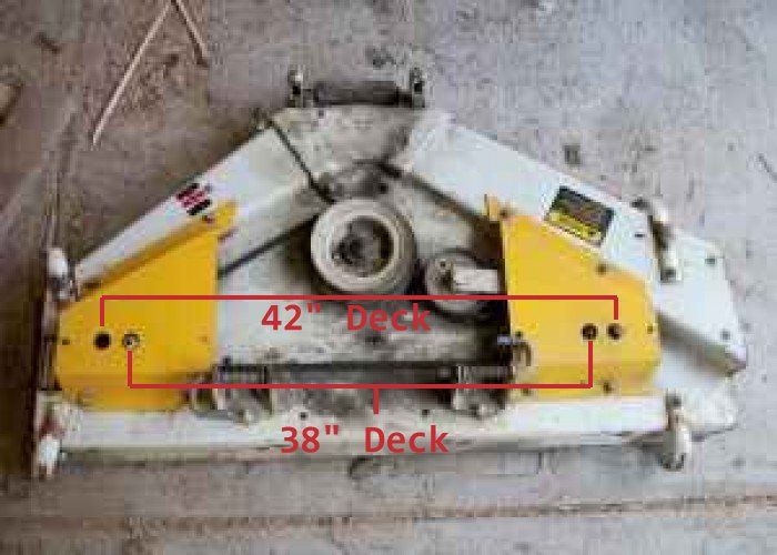 I don't know much about these but I suspect a picture would help a ton in identifiying the deck. One thing I do know is there were 2 different series of deck, one with the pulley centered at the front and one with it offset I beleive to the left, these typically had mule drives with angles pulleys. I may be off on the sizes but I think the centered pulley decks were 38, 44, and 48 and the offset were 42, 46, and 50.