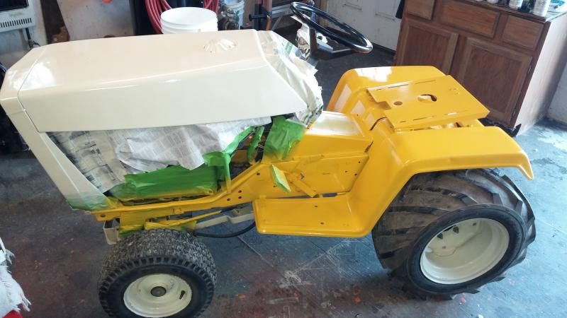 Well, it's coming along. Please bear in mind I am not a tractor guy and have never restored anything in my life. We have had this tractor at our camp since we bought it new and thought it would be nice to revive the old girl so we brought it home and are giving it a shot. As mentioned, the mechanicals were taken care of by the local dealer and we are handling the cosmetic end. Paint is pretty much done and decals should be going on tonight.