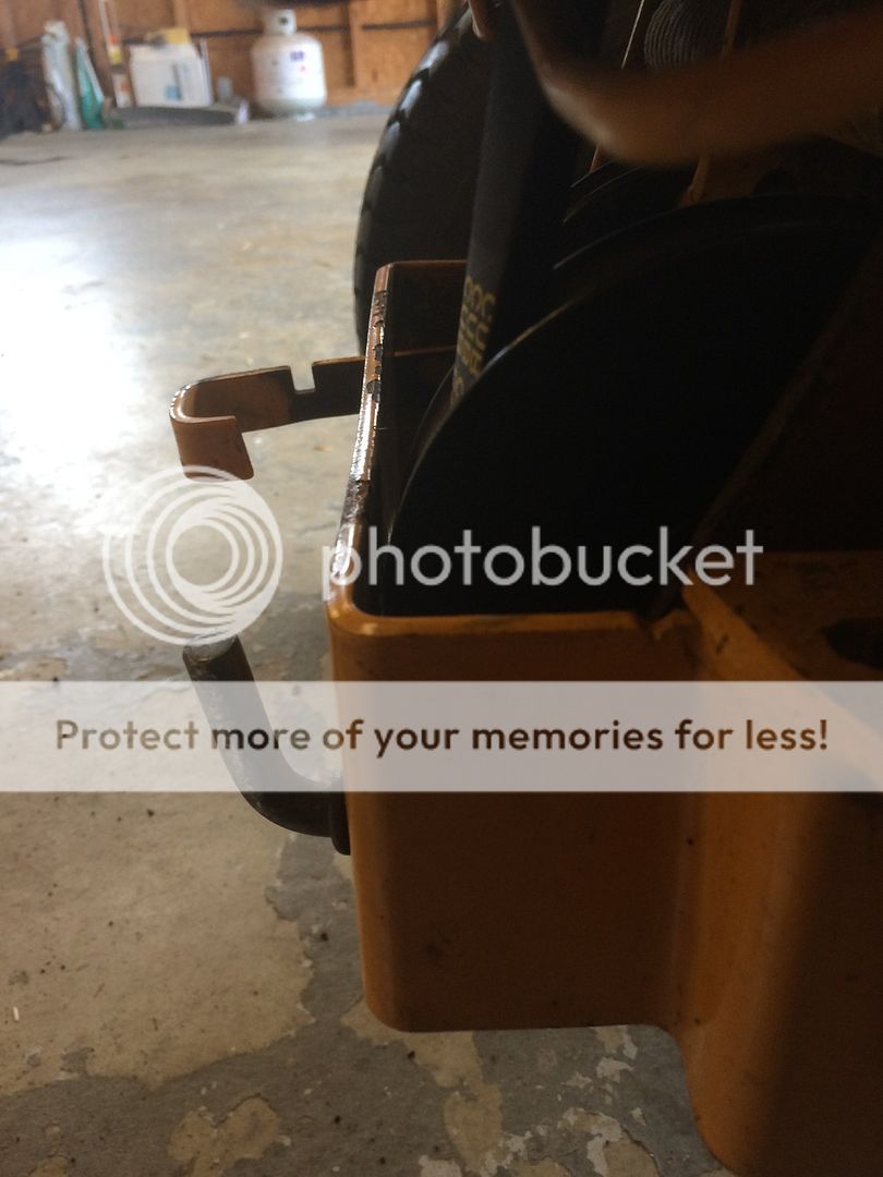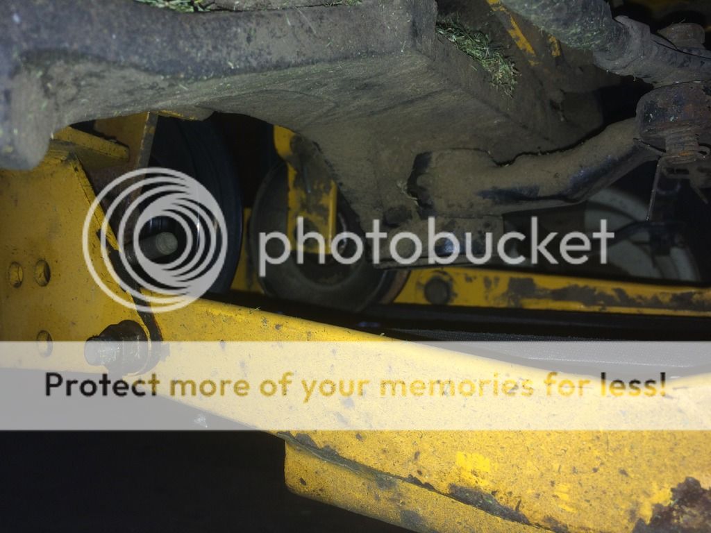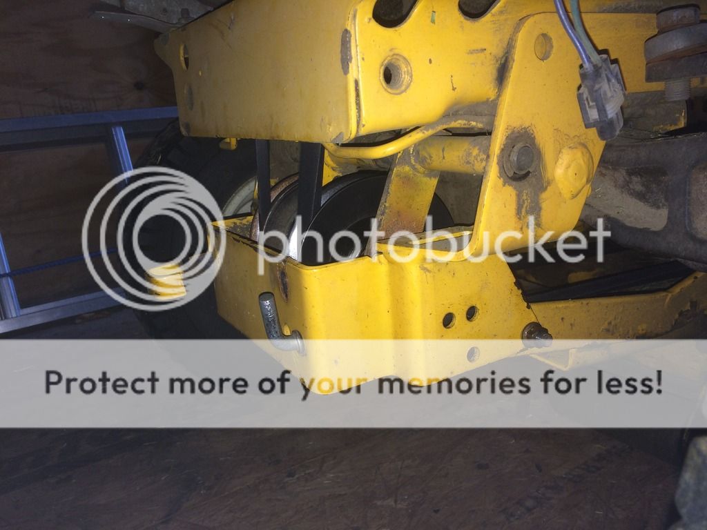 I'm back with a question about my 2082 with the 54" GT deck and I need another nudge in the right direction. Last time I mowed I ended up having to stop halfway through and do some work on the belt tensioner on the deck. It wouldn't hold tension on the deck belt, so I cleaned up the spring with some PB blaster and compressed air and it seemed to free everything up so I could get the yard done. While I had the deck out I did grease the tensioner. When I was putting everything back together I noticed the PTO drive belt was way out of adjustment as per the 324 deck manual I've got. I picked up a brand new belt from the local dealer and yesterday I installed the new belt and tried adjusting everything again, and I can't get it adjusted the way the manual wants. If I adjust the adjustment arm in, so the pulley and belt ride lined up with the V notch in the frame (Right side as your looking from the front), the left side is way off (has the spring loaded arm with a notch to hold the pulley back). If I adjust the arm out, and pull the spring loaded side back in so the V notch on that side is positioned correctly, the adjustment arm side pulley rides way forward of it's V notch and almost touches the front of the frame. I've included a couple pictures as I'm sure you guys can't picture what I'm saying from my babbling. ![]() Thanks for the nudge. Right side adjusted ![]() Left side adjusted