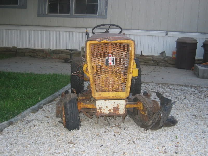 My first post here, what a great place to find much needed info on this Original I came across buried in the trees and vines on the property of an old farm house my son is renting. I hope to come across enough parts to get it going in the next year or two. It was given to me by the owner, he said it barely missed going to salvage the last time they hauled scrap iron. It really is in about as sad of shape as one can get in I suppose. It spent twenty years plus out there. The motor is blown, no doubt, rod is loose when you turn the crank by hand. Water has been in the transaxle for years now, ring and pinion and all lower gears in the trans are too pitted to use sadly.
