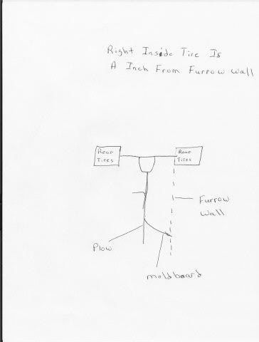 This is the correct way to measure it: ![]() The depth the plow goes is 1/2 the width of the moldboard. 8 inch wide plow is design to go 4-5 inches deep 10 inch wide plow is design to go 5-6 inches deep 12 inch wide plow is design to go 6-7 inches deep You need to remove the right rear dual to get you tractor to plow right. It should look something like this one: ![]() The outer cutting edge of the plow share should be even with furrow wall as shown in this drawing: ![]() Not the best drawing..... There is some ajustment for the point. When the point and the landslide should be against the furrow wall and and against the bottom of the furrow. Here is an example: ![]() I would strongly suggest you invest in a coulter for your plow. It saves wear and tear on your moldboard and the plow will pull easier. I won't plow without a coulter. The soil where I live gets dry and hard to plow this time of the year. That could be part of the problem. It looks like you use part tiller bracket to make you plow. |