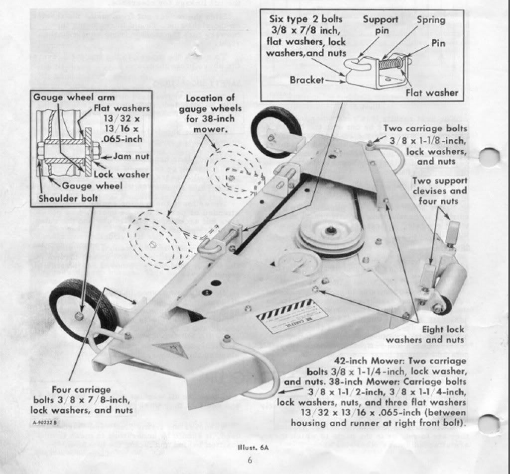 Mounted the 42 inch deck on my 1450 this morning. Gauge wheels won't clear the 23x10.50 tires. What's the problem? I tried mounting the gauge wheels on both sides of the brackets, neither side worked. I'm going to try to mow with it as I remember seeing a 42 inch deck with no gauge wheels. Gauge wheel mounting brackets will not interchange side to side. There are 2 holes on top of the shell, close to the center, but no holes in the rear panel that goes down.