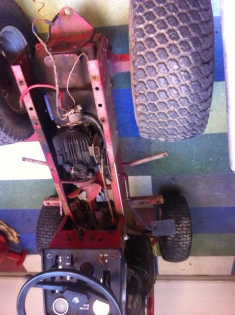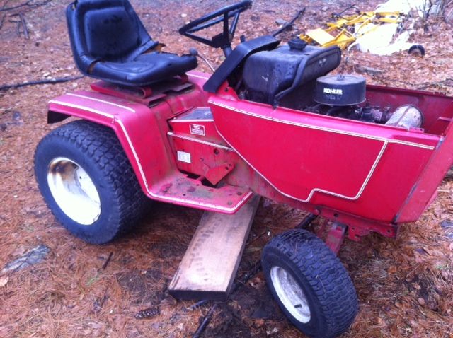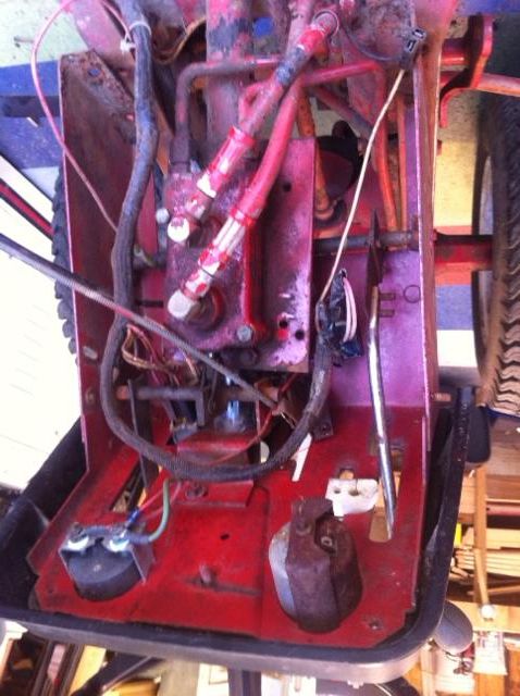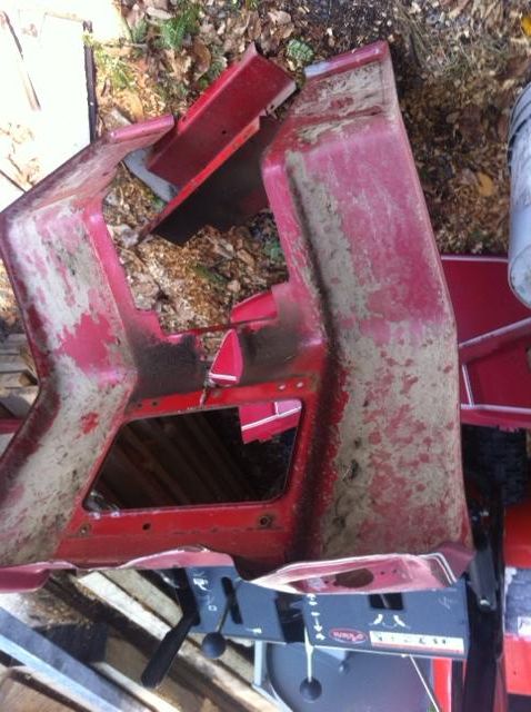 Positive attributes: Its red (actually tad too much pink in it, but sorta red) It has a S/N plate (havent looked it up) It wasnt expensive (rarely is something 'free', it cost in one way or another) It runs. And sounds pretty decent even. No big knocks or taps to my ear. The emblem on the front looks good. It has pin stripes. It has tubes in the rears (I happen to need a set of tubes) The side panels are decent The front grill is there The hydro works and no big whine and seems ok No leaks (no oil leaks, no hydro leaks) Mule drive seems all there (if I have the right terminology) I didnt pay a lot More questionable attributes: The hood is missing (embarrasingly, it was there when I left for home... )Rotted rims beat up, and rotted fenders Seat, ditto Some tins missing in/around the engine Steering quite loose Tie rods ditto No battery After market switches and push button starter (but of decent quality) No safety switches (brake, seat, et al) Some wiring splices (but again, it runs) dash cracked starter only engages every 5th or 10th attempt 87 other things I did pay 'some' (am pretty comfortable I can get the $$ backs, even just in what I save on the rear tubes....) The PO had it 20+ years, and it was send it home with me or send it to scrap. The question is... now what do I do with it? I do have a project I can steal parts for - or could swap the other way and have a red 782 (784 since I want to end up with a dual hydraulic). I cant see trying to piece this all back together as stand alone Pics are worth a thousand, so here you are. ![]() ![]() ![]() ![]() ![]() ![]() ![]() ![]()
