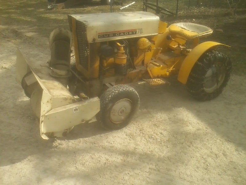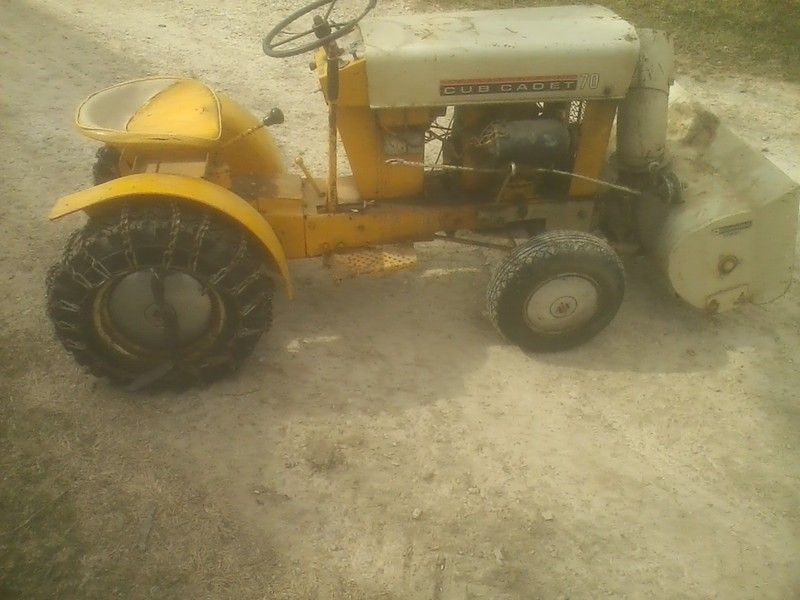 I have always wanted an Original, and a month ago or so I received a pic of a cub Original that was belonged to a friends father, and after he passed they wanted the "junk out of the garage". Knowing that I was a cub guy he asked if I wanted it. Of course, I said not knowing anything about it. So Yesterday I finally did the 100 mile trip to see what I had won and needless to say I am quite happy. It is a 61 Original Serial 6830 with factory fenders, Danco BB36 thrower and a Danco underdrive. It has chains original tires, 4 decent hubcaps, the original seat cover and I think it will run without too much trouble. Besides a few custom touches by the previous owner it is in great shape. the only thing I can see that is missing is the hood ornament and possibly the lower portion of the oil bath air cleaner ( but it might be under the tin can that is screwed to it). I think I will restore it, add a 3pt rear lift and install the 1 hole Brinly 10" plow I have for it.