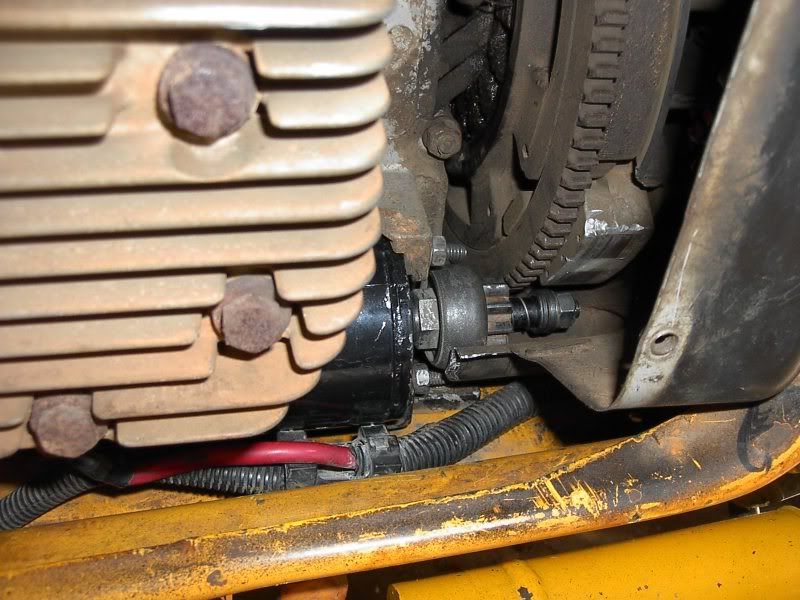 OK, I keep getting set backs on this project I am working on. I finally got some time to start on this again and in the process of starting the engine it stopped turning over. Well as you can see in the pictures the starter is stuck in the engage position. I can't turn the engine enough to free it. I guess I'll pull the engine and take the starter off. I cleaned it and put a new return spring on a while back and it was working great. I hope it is just a starter problem.