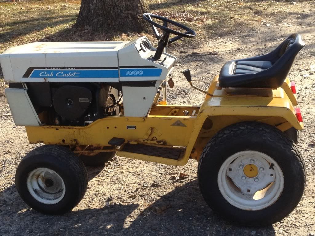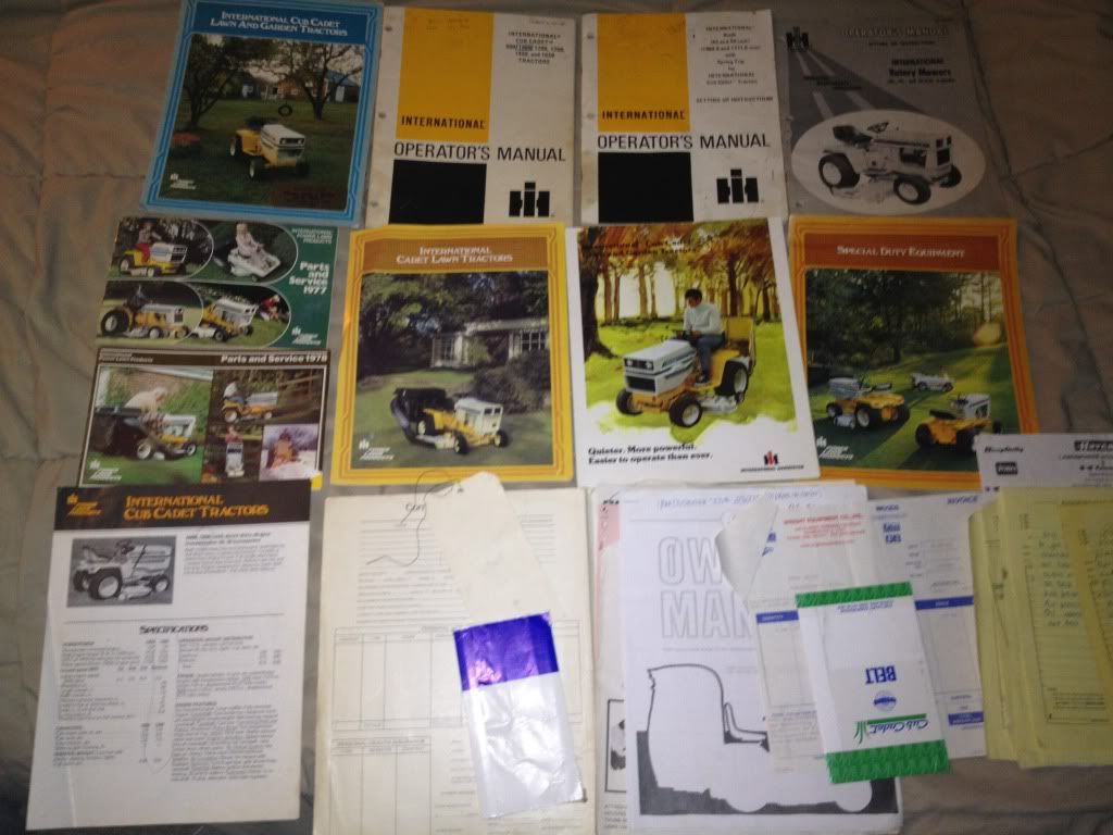 For starters I am new to Cubs... about three weeks ago I picked up this Cub Cadet 1000. I wasn't looking for another garden tractor at the moment, but I was surfing craigslist, and saw it and realized it was only 2 miles away from my house and came with a mower deck, snow plow, and a Peco rear vacuum. So I went a took a look at it. I told the guy after looking it over that, if I could get the engine to run I would take it home with me. Well after running 12v to the coil, and using a jumper on the starter and a spritz of starting fluid she started and stalled. That was good enough for me. The price was definitely right and it is all original. Along with coming with all of the original manuals, paperwork, and service receipts made it even better. I rebuilt the carb, flushed the gas tank, changed the fuel line, cleaned the battery ground point, and she started right up and runs great. When I tried to drive it I was met with a loud grinding/chattering noise and decided to pull the drive shaft cover to find out that the drive shaft is bent. So I have to fix that but otherwise it is a nice sound original unit.Here are some pictures and a video of it running!