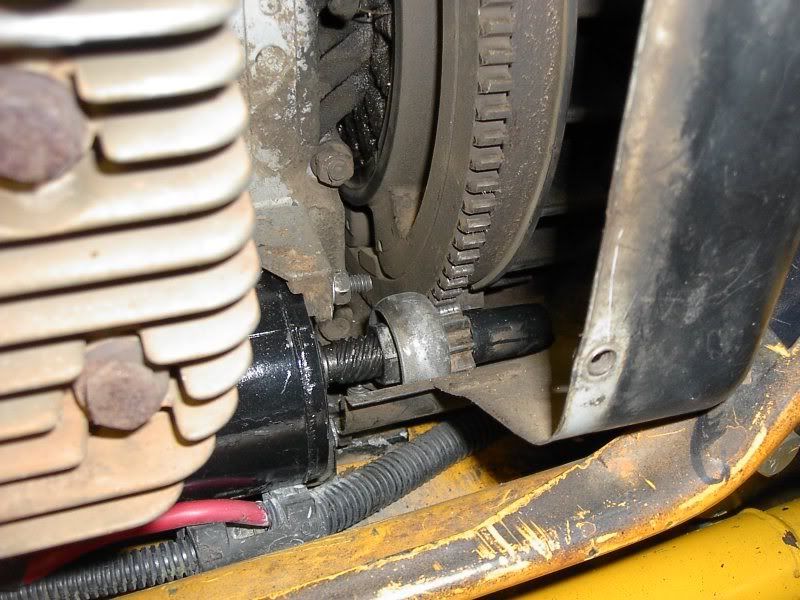 OK, I keep getting set backs on this project I am working on. I finally got some time to start on this again and in the process of starting the engine it stopped turning over. Well as you can see in the pictures the starter is stuck in the engage position. I can't turn the engine enough to free it. I guess I'll pull the engine and take the starter off. I cleaned it and put a new return spring on a while back and it was working great. I hope it is just a starter problem.