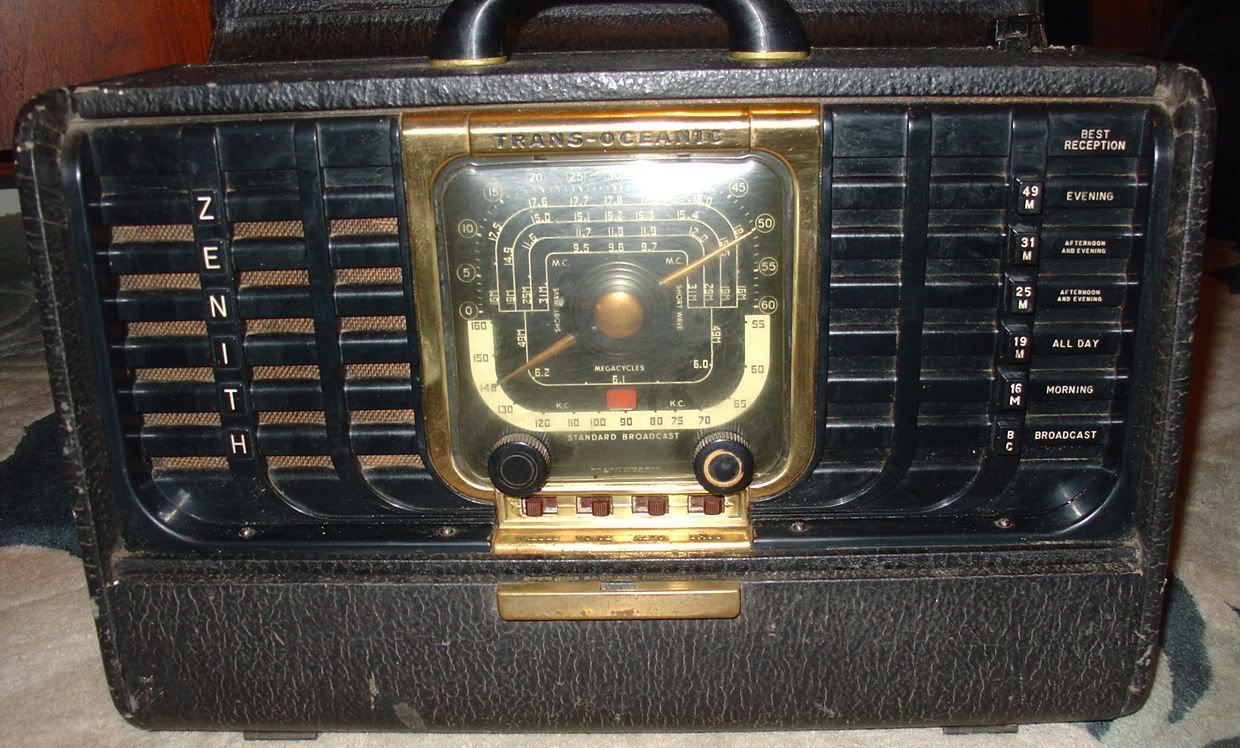 A working Zenith TransOceanic exactly like yours pictured. ( Aren't they about 1951 - 52 vintage?) A working '50s Zenith Flip Front tabletop A non working '40s Zenith tabletop with the old "Model 299" outline stitched into the speaker fabric ( The 299 was the prototype of the B17 Flying Fortress) A '40s Zenith phonograph/radio combo A couple of working '50s RCA tabletops I think I have a couple others but I don't remember right now. I love swing and '30's jazz so I bought a small AM transmitter (1/4 mi range) to hook my ipod to and play my music from my own "Radio station" over all of the radios - Ya gotta love that old tube hum! |