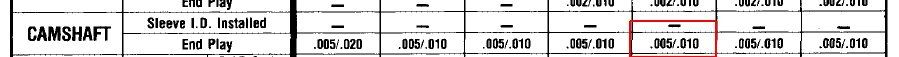 oops, i meant to say .006. i didnt have enough zeros when i wrote my post. im sorry. anyways, i was looking right at the book when i put it back together. i used the appropraite shim in the side of the cam as well. i do look at the book when i put an engine back together and i use a feeler gauge set as well. i dont even know if it is possible to have .06 camshaft end play, lol. the cam would have to be extremely worn out.