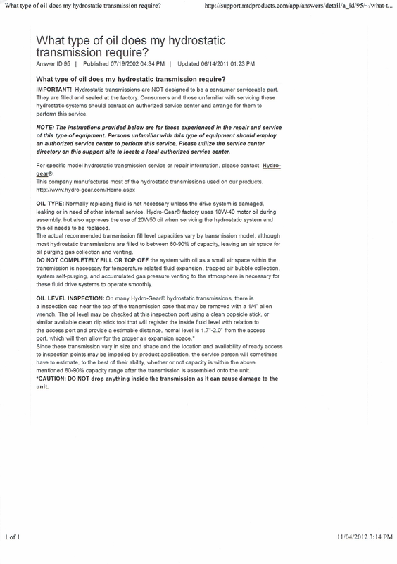 Here is the correct and proper Hydro fluid to use, per the Owner's Manual, on page #60. 737-3055, This part is replaced by 490-000-C051.