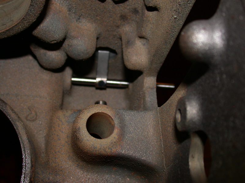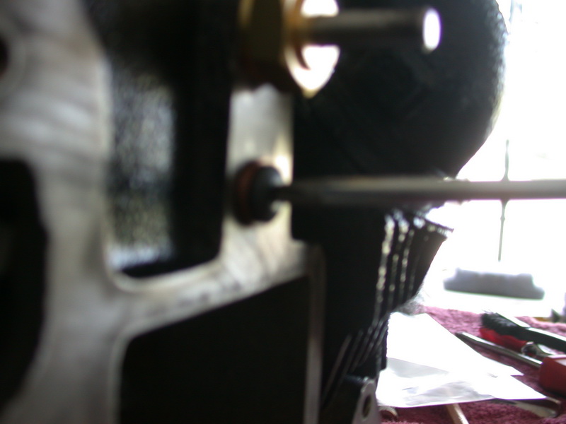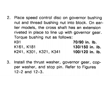 The shaft goes in first: . . . Here is your governor gear. You'll note that the pin sticks up when centrifugal force expands the weights: . . . That pin will push up on the lever that is welded to the shaft. . This thin washer came with the new governor gear. I don't have any record of this washer on disassembly (and I haven't looked through my old parts yet) but I figure it has to go on the pin the governor gear sits on, before the governor gear. It lays flat and hides up there, so it's possible I never noticed it on disassembly. . . So I put it in place on the pin: . . Then pushed the lever up so there's room to get the governor gear in place: . . And installed the gear: . . Next this spacer over the shaft from the outside: . . And then the bushing. . . The service manual shows a "plain washer" in here, but I don't see one in my disassembly pics. Again, I'll have to check the parts (I'll update this post after I do, it's late...) The bushing gets tightened to 100-120 inch lbs, per the manual. And that's as far as I got tonight. I haven't put the stop pin in yet. <edit 9/12/11 - Just now adding the pics of the stop pin> The stop pin and copper washer go in last: The manual mentions turning the gear to assure that the stop pin isn't hitting the weights. <End of 9/12/11 edit> This bit from the service manual confuses me: ![]() . I'm guessing they refer to the "plain washer" as a speed control disc here (?) And I don't know about this riveted extension - mine probably doesn't have it. And I'm guessing the "thrust washer" is the one I put on the pin under the governor gear. Just checking... |