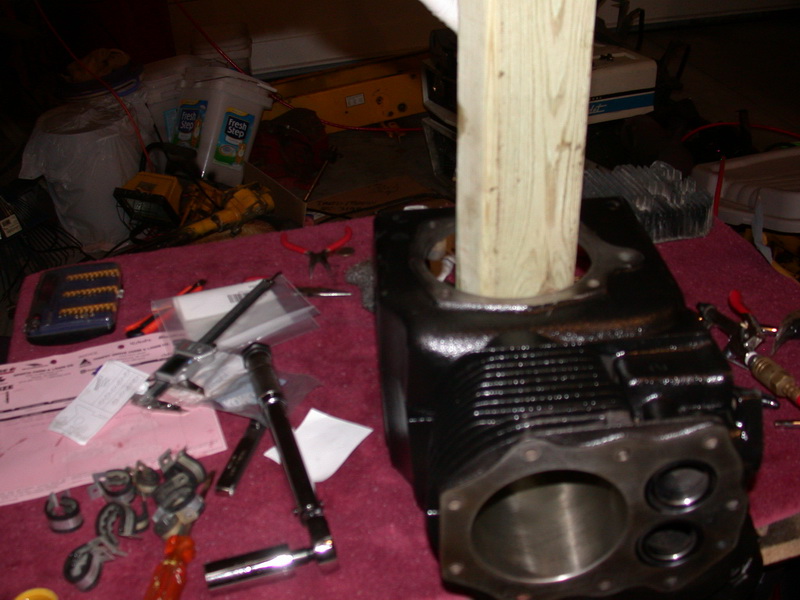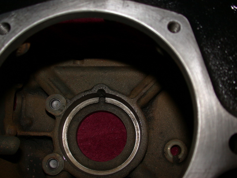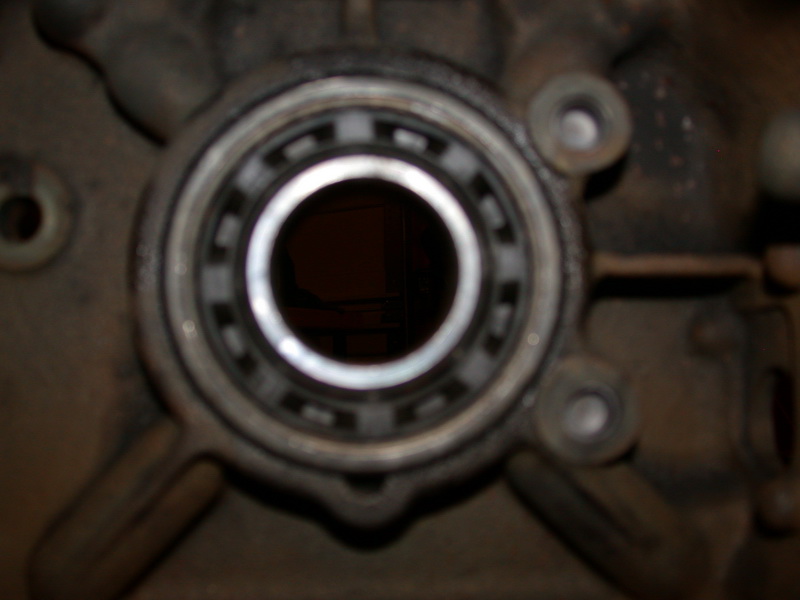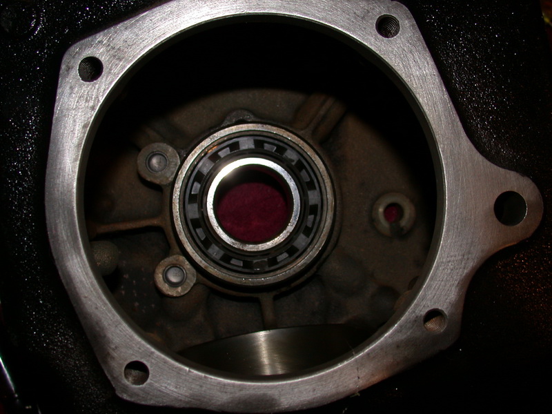 Here's the seat for the bearing: . . I gave the surfaces a light coating of engine oil to help it go in a little easier. Here's the bearing sitting in place ready to drive it in. Mine is a shielded type bearing, so the shielding goes on the inside: . . I then laid it flat on the bench, and (lacking a #4747 handle and appropriate bearing installer) used a piece of 2x4 to drive it into place: . . And here it is, seated (a bit blurry, but you get the point) . . Some concern about dust, dirt, and wood particles on this procedure, but I blew it all out again with compressed air. I can't do this in a medical clean room after all, and I'll change out that first oil early. |